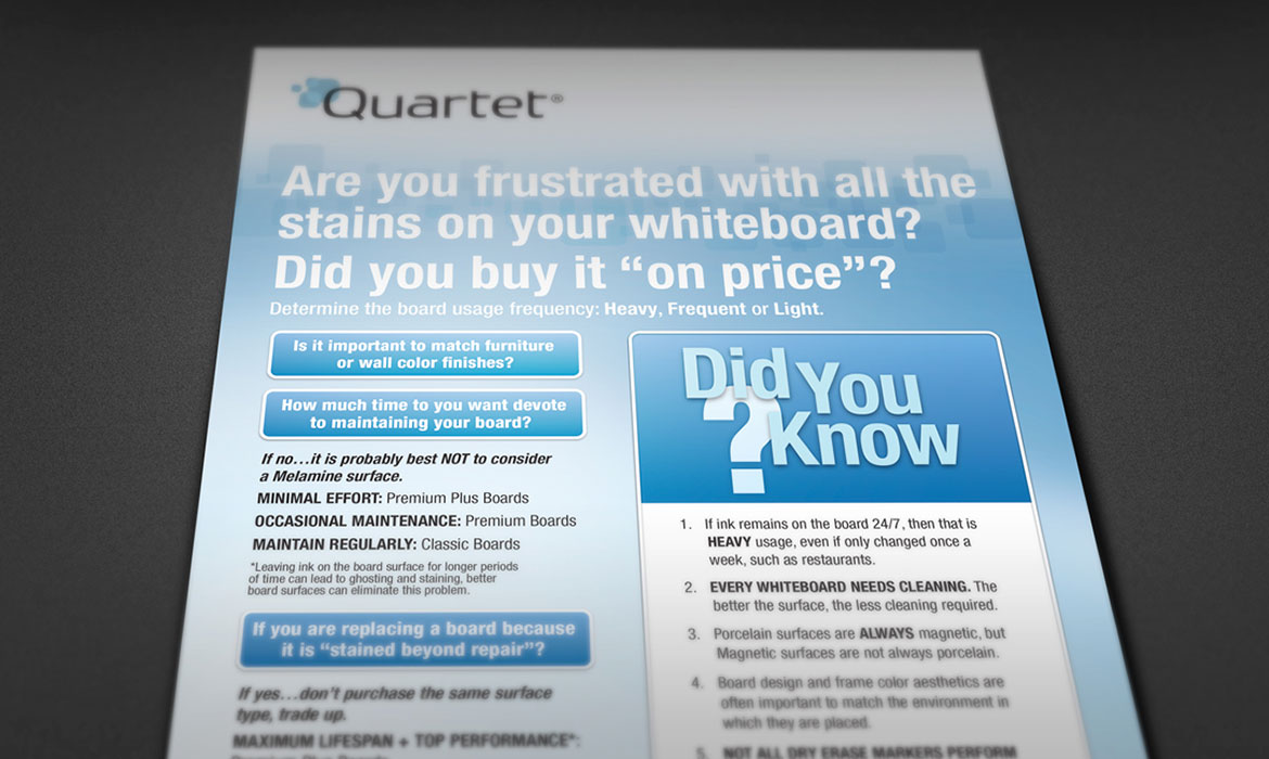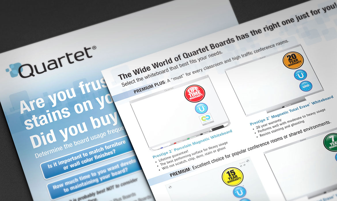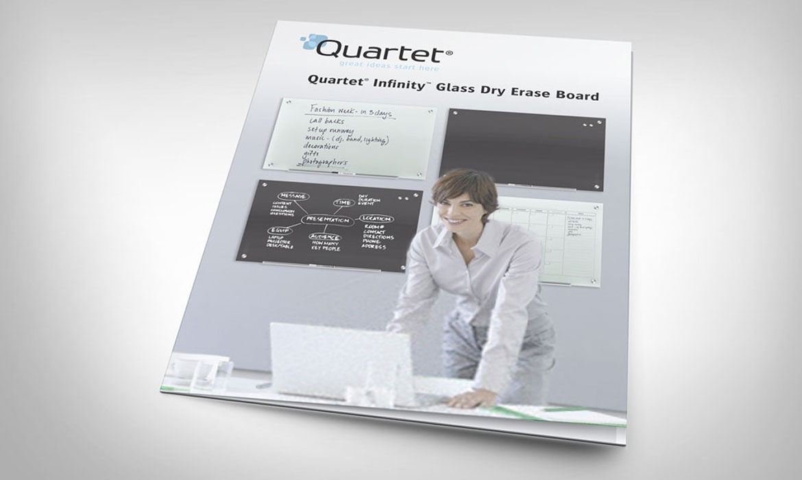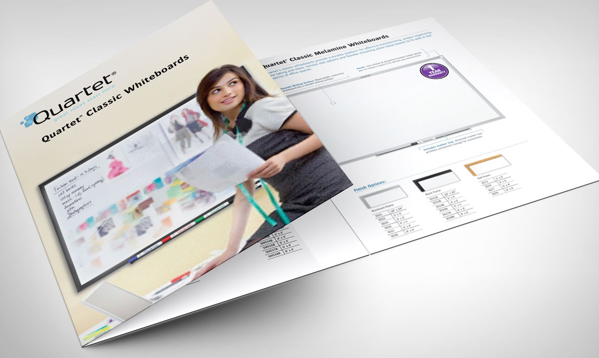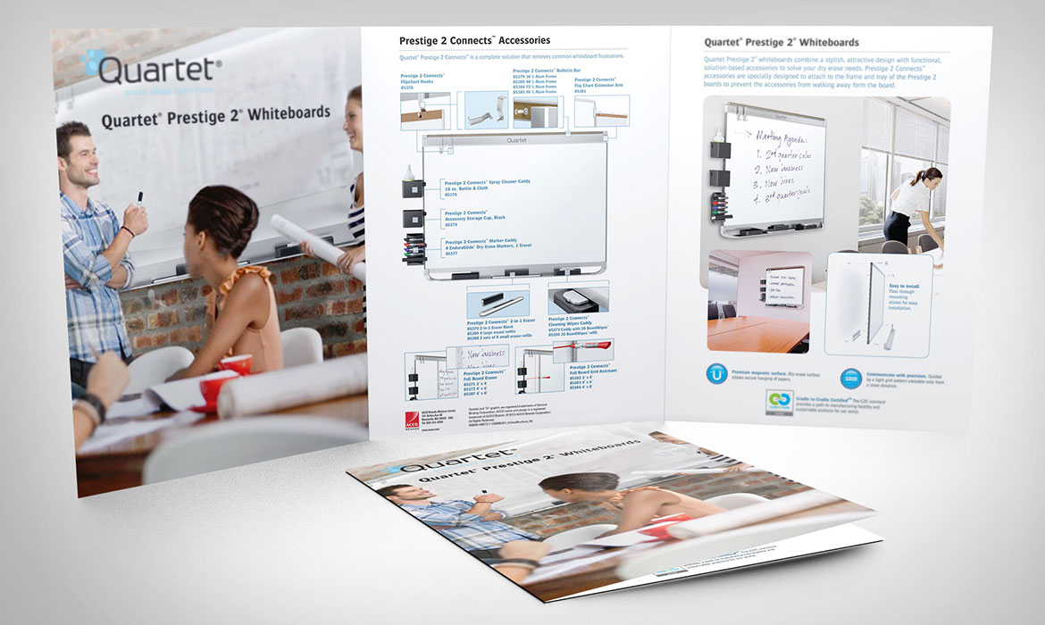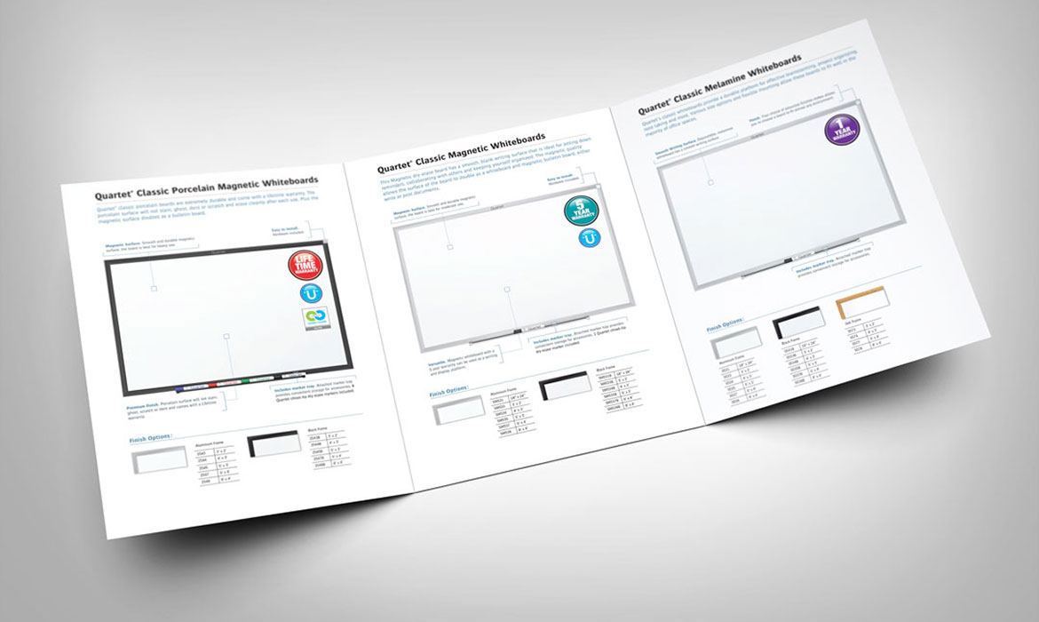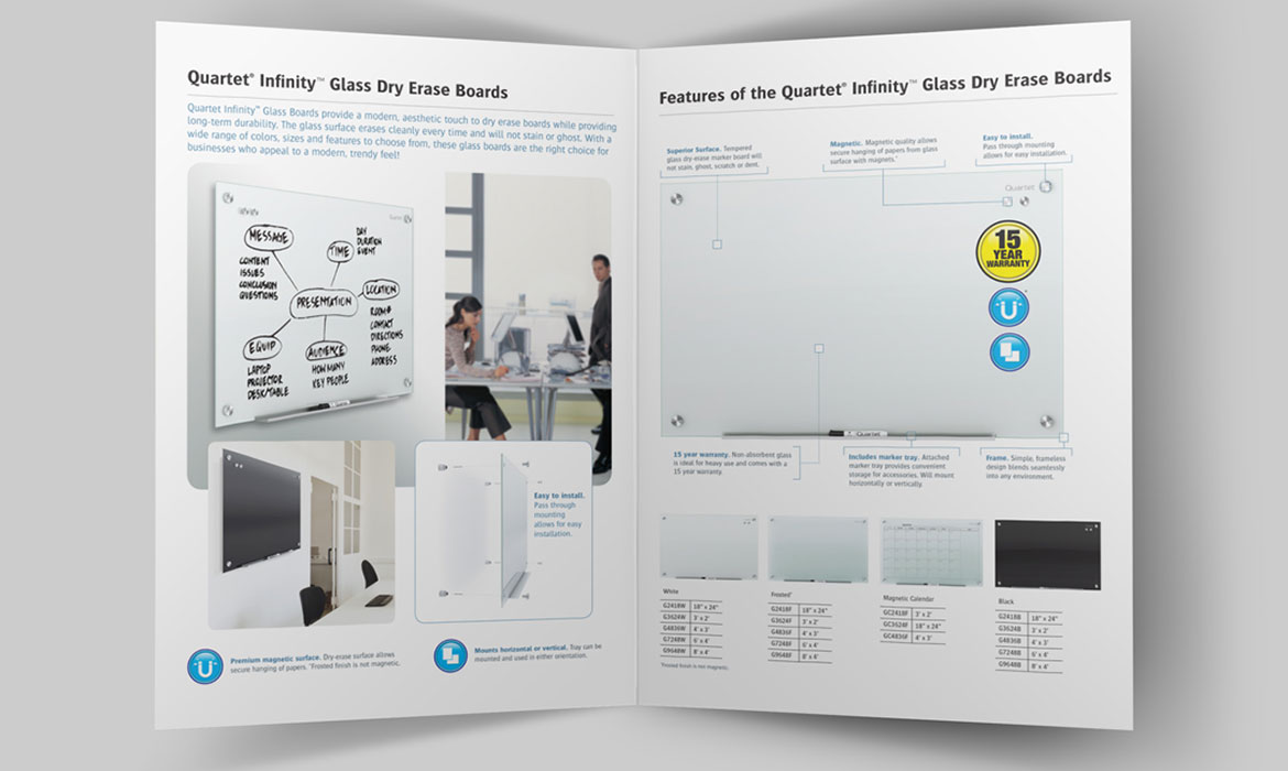 B2B campaign and sales materials produced for a top global office products manufacturer to support the launch of an executive sub-brand of bulletin boards, whiteboards, and calendar boards. The engagement included branding recommendations and complete production assets. As a thank you, the company gifted us a glass board and bulletin board, which was a meaningful gesture after the project’s success.